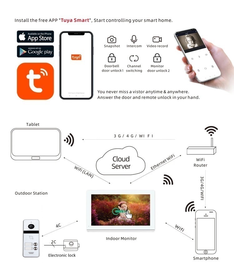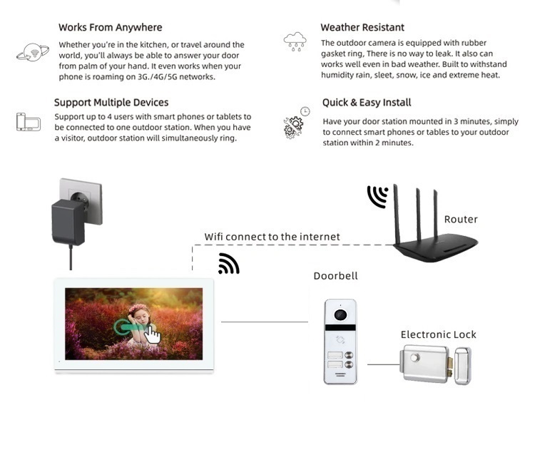 Support max. 2 outdoor stations+6 indoor monitors+2 CCTV cameras+2 motion detectors.