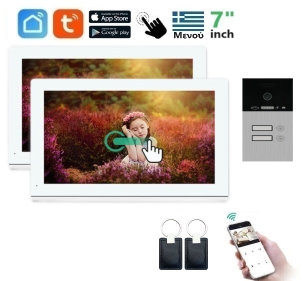 Σετ θυροτηλεόρασης Joytimer 4 καλωδίων με οθόνη Wi-Fi TUYA Smartlife APP 2x WHITE RFID IC CARD UNLOCK HD TOUCHSCREEN LED 2MP Video Doorbell Set with 7" Screen | 66730W-64253IC2S