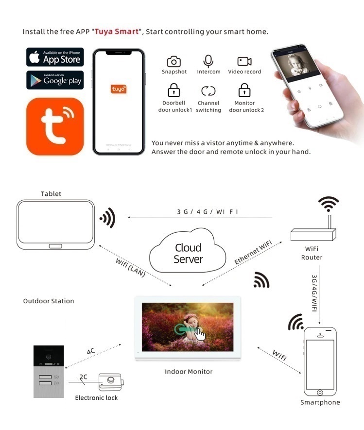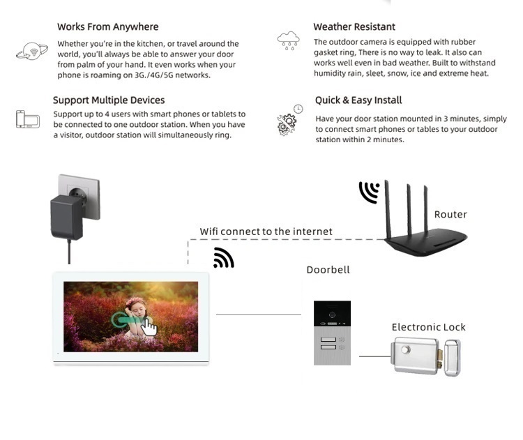 Support max. 2 outdoor stations+6 indoor monitors+2 CCTV cameras+2 motion detectors.